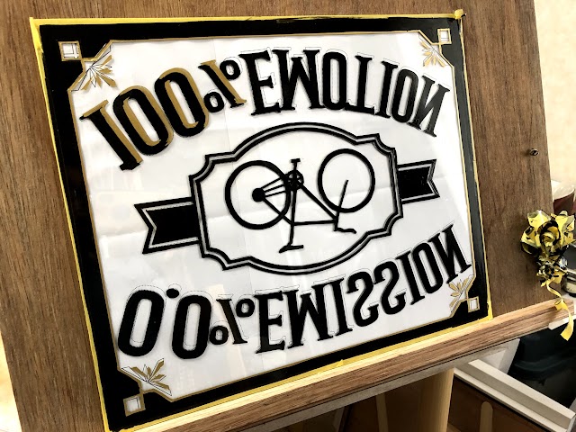 ちょいとクサいですが、「0.0% EMISSION (排ガス0%)100% EMOTION(感動100%)」という言葉、センターには写真からトレースした自分の自転車のシルエットを配置しています。